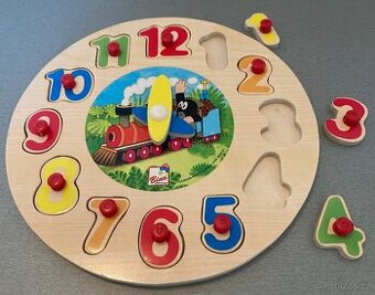 Dřevěná vkládačka - hodiny s KrtečkemHraná vkládačka , jako nová. V nabídce i další hračky s Krtečkem .