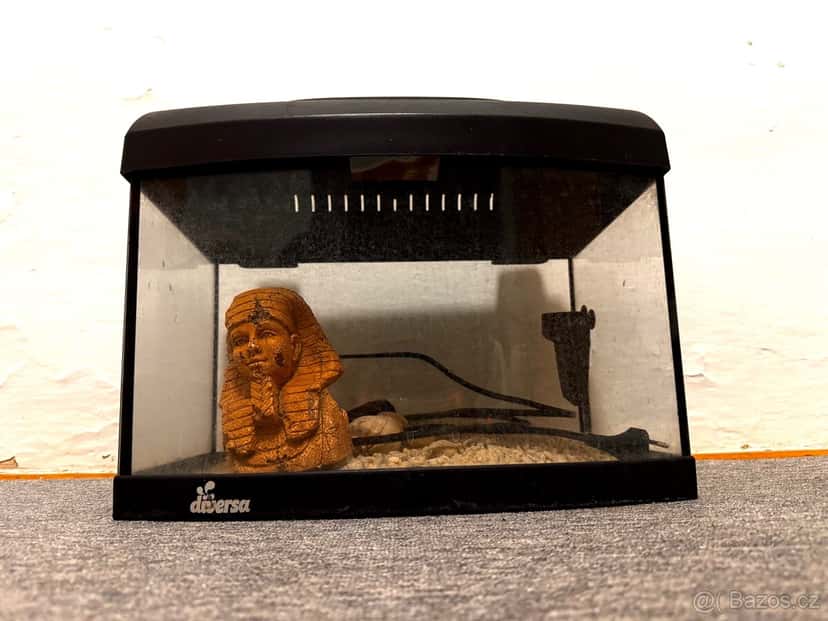 Akvárium Diversa s filtrem Prodám kompaktní skleněné akvárium značky Diversa s černým plastovým krytem. Vhodné pro malé ryby, krevety, šneky nebo jako terárium. Popis a vybavení: • Skleněné akvárium v dobrém stavu, bez prasklin • Kryt s ventilačními otvory • Vnitřní filtr (součástí balení) • Substrát (štěrk) • Dekorace – soška v egyptském stylu Akvárium je čisté, udržované a připravené k okamžitému použití.