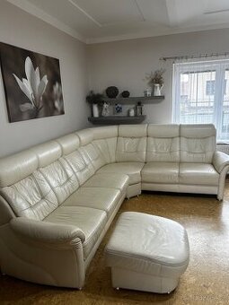 Prodám koženou sedací soupravu.Velmi pohodlnou a zachovalou. K Sedací soupravě je taburetka na nohy a potah na sedací soupravu v hnědě barvě.
