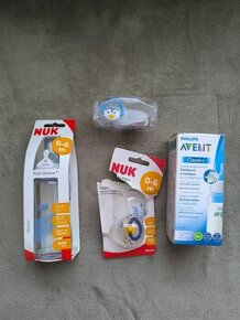 Prodám dvě nové dětské lahvičky na mléko. Avent plastová, NUK skleněná. Přidám dva nepoužívané dudlíky.