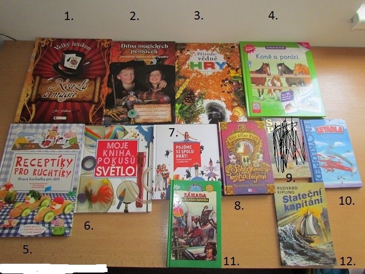 Prodám dětské knížky: 4.-Koně a poníci-tvrdé stránky s otvíracími okýnky-35,-Kč 6.-Moje kniha pokusů-světlo-Neil Ardley+Pete Gardner-29 stran-25,-Kč 7.-Pojdme si spolu hrát-Maria Thorn-123 stran-30,-Kč 8.-Pohádková kniha legend-Shannou Haleová-245 stran-40,-Kč 11.-Záhada koktavého papouška-na 1 straně je napsáno věnování ze školy-121 stran-25,-Kč 12.-Statečný kapitán-Rudyard Kifling-223 stran-30,-Kč Všechny knížky jsou ve velmi pěkném stavu.