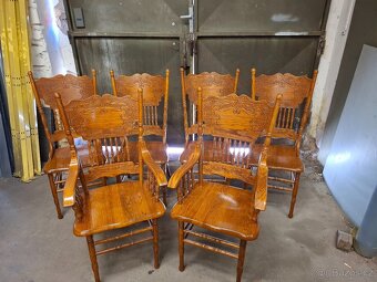 Velmi zachovalý dubový set židlí 4x bez opěradla rukou 2x s opěradlem rukou Velmi zachovalé, pevné, nerozklížené viz foto