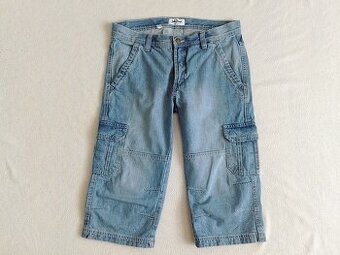 Prodám 3/4 džínové kalhoty, velikost 48 (M). Kraťasy mají úzké nohavice, kapsy na nohavicích a zapínání na zip.