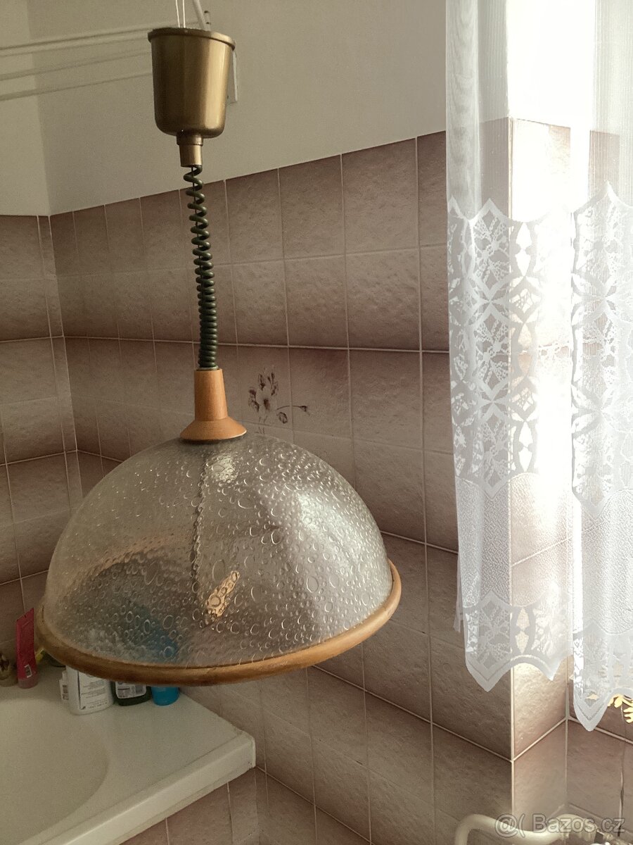 Prodám lustr i s úspornou žárovkou, kombinace dřevo a plast. Průměr 43cm, výška 65cm . Cena 200kč, osobní odběr Prostějov