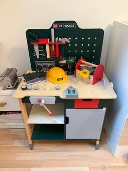 Vlastnosti Vyrobený ze stabilního masivního dřeva V designu PARKSIDE Lze nastavit do 3 výšek (97/101/103 cm) Podporuje jemnou motoriku a porozumění technice a inženýrství Realistické nářadí navržené pro dětské ruce pomáhá malým kutilům vše opravit Elektrický akumulátorový šroubovák se změnou směru otáčení, otáčející se pila a funkční svěrák 4 realistické zvuky (řezání, vrtání, broušení, tlučení) s dotykovou klávesnicí Skříňka s dvířky, zásuvkou, policí a boční stěnou Dveře skříně s popisovací tabulí (včetně 3x křídy), magnetickým držákem a kovovými panty Zadní stěna s policí a 25 otvory pro našroubování příslušenství Rozsáhlé příslušenství: rukavice, pila na dřevo, kladivo, klíč, šroubovák, úhlové pravítko Rozměry: cca 68 x 42 x 97/101/103 cm (D x Š x V) Kompletní, drobné opotřebení. PC: 2000,- Aktuálně na Lidl shopu za 1700,-