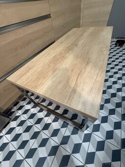Prodam tento rucne vyrobeny stolek, nehodi se mi po zmene obyvaku. Deska tl. 4cm drevotriska imitace dub. Nohy nerez. Stul je velmi pevne, tezky, bez jakehokoliv poskozeni. Ve spodni casti nohou jsou jeklové zátky - funguji jako kluzáky proti poskrabani podlahy