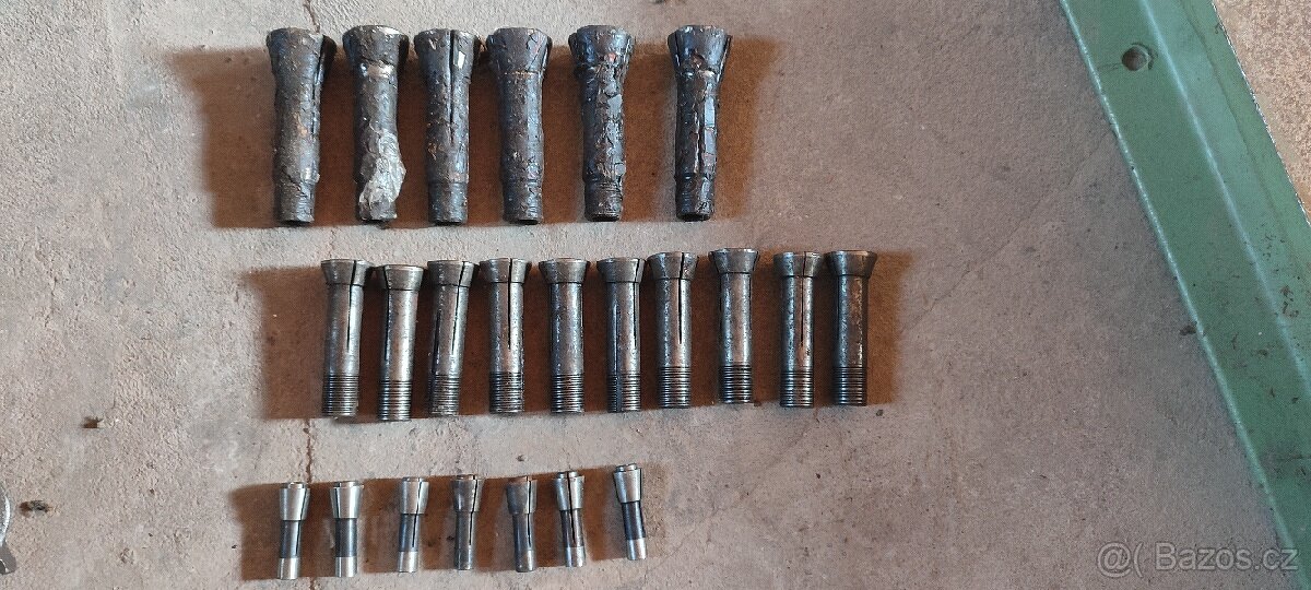 Prodám tyto upínací kleštiny. První typ má délku 105 mm, průměr závitu 20 mm a průměr za závitem 22 mm. Stejně kleštiny jsou i na posledních fotkách již lehce omyté z konzervace. Kleštiny mají tyto rozměry 6;7;9;11;12;13;15 Cena 100 Kč 1 ks. Druhý typ má délku 83 mm, průměr závitu 18.5 mm a průměr za závitem 18.5 mm - tyto kleštiny mám v těchto rozměrech: 5;6;7;9;11;12;14;16. Některé jsou nové ještě zakonzervované tudíž nebyly použity. Cena 100 kč 1 ks. Vřetenový šroub 2 ks ke kleštinám č.1 Cena 300 kč 1 ks. Můžu to poslat i na dobírku.
