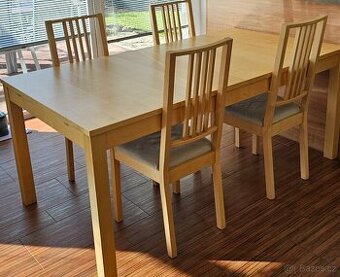 Jídelní stůl i s židlemi IKEA Stůl délka 175 cm, šířka 95 cm, výška 74 cm. Stůl je možné i rozkládat. 4x židle Börje. Stůl i židle používané, ale i tak v dobrém stavu. Stůl má malé vady ve formě škrábanců na desce. POUZE VLASTNÍ ODVOZ (OSTRAVA)