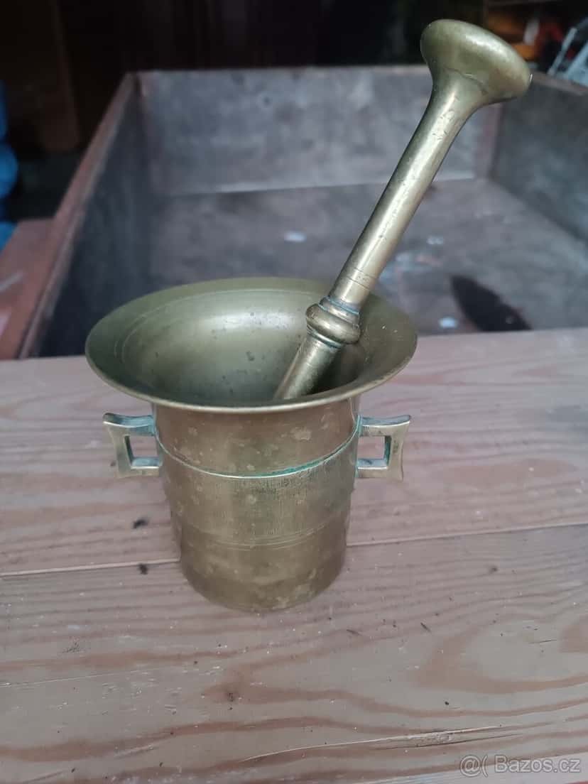 Mosazný hmoždíř výška 11 cm. Možné předat na trase Písek Protivín Vodňany České Budějovice nebo zasilkovna.