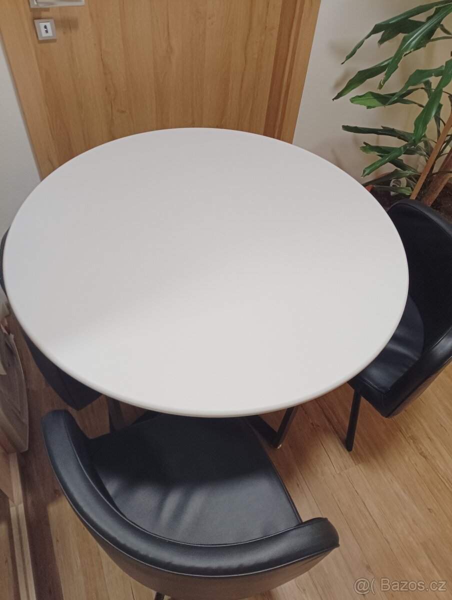 Prodám kulatý stůl ze 4 židlemi. Stůl je bílý průměr 100cm židle jsou černá ekokůže
