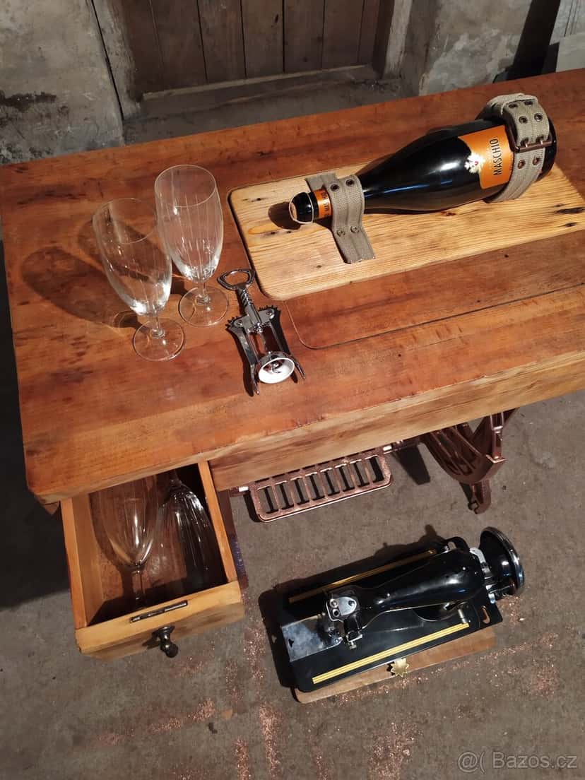 Cena: Nabídněte. Prodám vinotéku zhotovenou předěláním staršího šicího stroje,který je součástí vinotéky.Vhodné na chatu či chalupu.