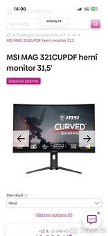 Cena: Nabídněte. MSI monitor na prodej Velikost displeje: 31,5" Typ panelu: VA Rozlišení: 3840 x 2160 (4K UHD) Obnovovací frekvence: 160 Hz Odezva: 0,5 ms Jas: 400 Důvodem prodeje je že jsem ho vyměnil za novější model monitor mi sloužil neměl jsem jedinej problém. Při rychlém jednání sleva