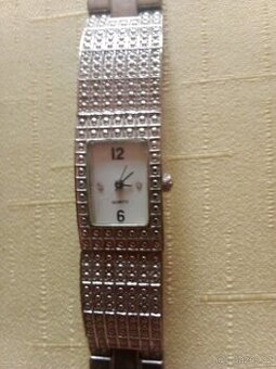 Dámské hodinky Quartz obdélníkového tvaru, s kovovým zdobeným náramkem. hodinky jsou na baterii a jsou funkční. Délka náramku je 19 cm.