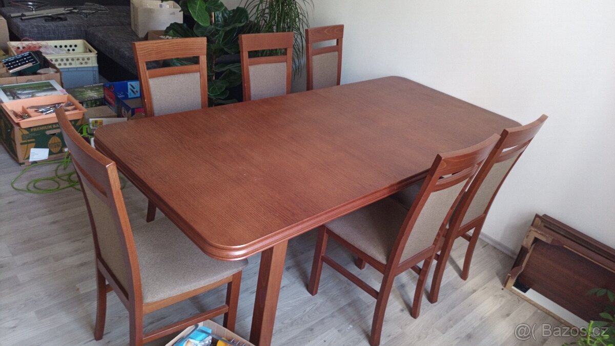 Prodám pěkný jídelní stůl. 200x90 výška 76, nastavení kus délka 40. 6 židlí. 720642825 WhatsApp nebo sms nebo mail. Sleva možná.