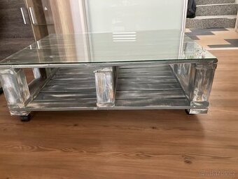 Konferencni stolek z palety na koleckach, natreny do stylu vintage, nahore sklo, lze sundat. Cena 400,- Rozmer 110x80x 36