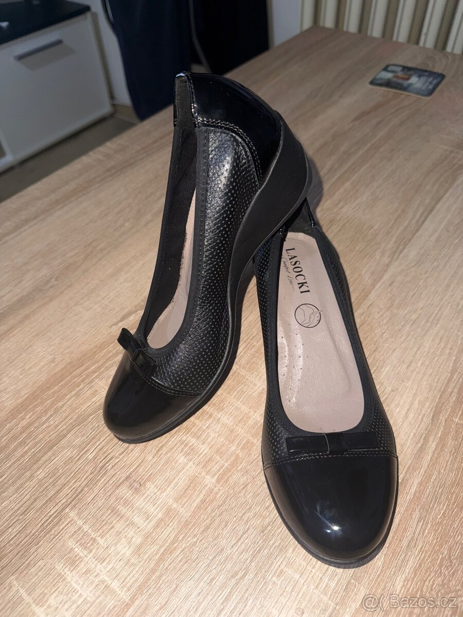 Prodám nové nenošené dámské lodičky černé barvy na klínovém podpadku vel. 36 zn. Lasocki. Platí do smazání inzerátu Karviná.