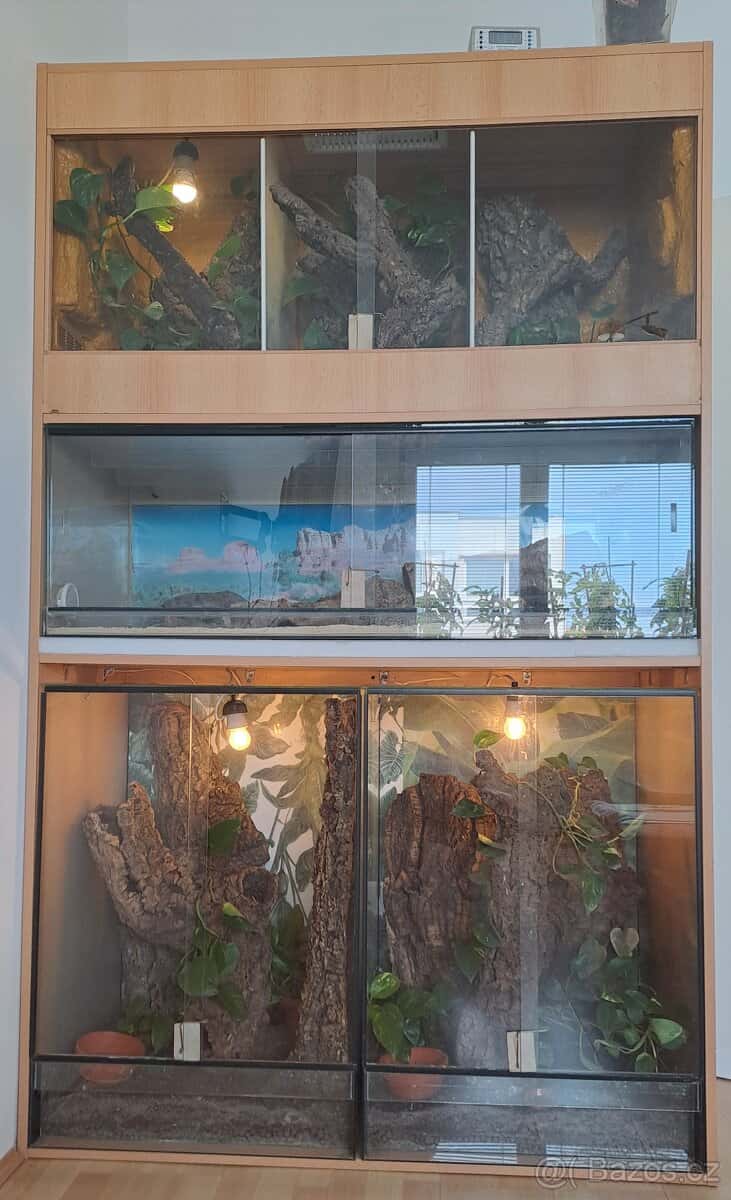 Cena: Dohodou. Prodam bednu kde se nachází šest terárií. Bedna je kompletně celá z lamina i záda 18mm s ABS hranou. Celá bedna je smontovaná konfirmáty, celkový rozměr bedny 125,2x52,2x203,5cm (dxšxv). Horní tři terária mají 3D stěnu plus každé má dvě velké korkové kůry a živou květinu, šoupací dveře po celé délce rozdělené uprostřed na dva díly. Vnitřní rozměr jednoho terária cca (3D stěna může zkreslovat) 38x45x64cm (dxšxv), větrání v horní a boční části bedny. Prostřední terárium je celoskleněné o rozměrech 120x50x40cm, větrání v zadní části po celé délce. Obsahuje šest korkových kůr a topný kabel. Spodní terária jsou celoskleněná o rozměrech 60x50x84,5cm, větrání v horní části a dále pod spodní částí dveří. Každé obsahuje tři velké korkové kůry plus živou květinu. Bedna a terária budou volná jakmile se prodají ještěrky které v nich chovám, v tuto chvílí končím s chovem. Lze prodat i po částech