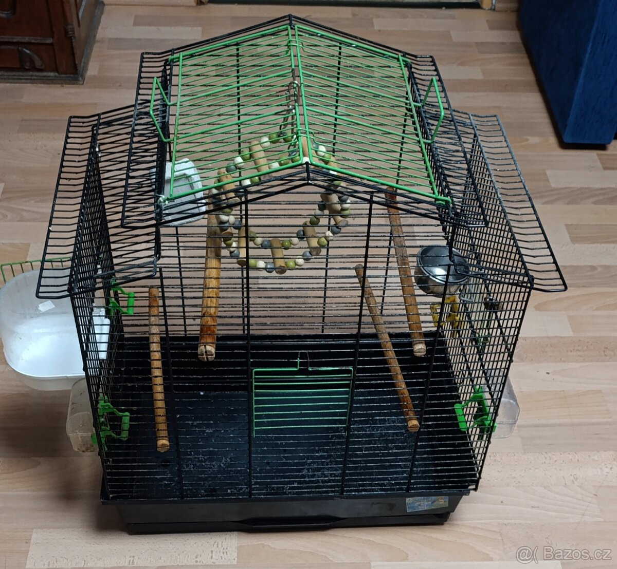 Prodám používanou klec po papouškovi, rozměry: šířka 53cm, hloubka 33cm, výška 65cm. Klec ma dvoje malá dvířka a otevírací celý vršek, 3 krmitka, pítko - misku na vodu, koupelnu, dřevěnou závěsnou hračku, vápníkovou kostku, 4 bidýlka - tyčky. Horažďovice