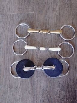 Prodám tři dvoulomena udidla. Mosazné a plastové jablíčko 14 cm, nerez 12,5 cm. Všechna nová, nepoužitá. Cena 250,- za kus.