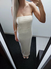 Nove kremove flitrove dlouhe saty zn. NLY EVE koupene na strankach ASOS. Pouze vyprane, nikdy nenosene. Barva kremova, lehce merunkova. Velikost 36 (S), pruzny material, s podsivkou, zapinani vzadu na skryty zip, gumovy pasek aby dobre drzely na prsou, vzadu rozparek pro snadnou chuzi. Postovne nebo zasilkovna 79Kc.