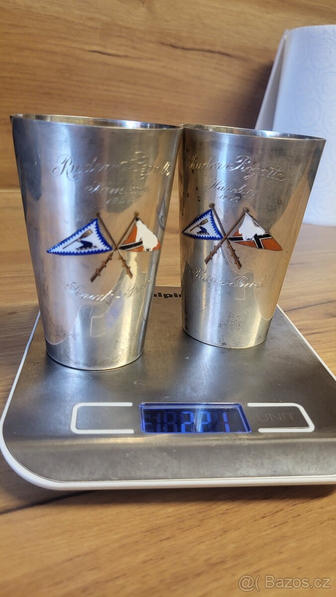 historické sportovní trofeje nebo suvenýry spojené s veslováním (nápis "Ruder Regatta"). Jedná se o dva stříbrné poháry.830 Poháry jsou zdobeny barevnými vlajkami a nápisy. Podle přiloženého měřítka je výška pohárů přibližně 10 cm. Jsou v krásném stavu