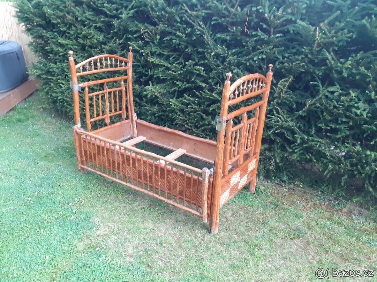 Prodám starožitnou dřevěnou postel. Postel byla používaná okolo roku 1900. Rozměry jsou: délka 157 cm, šířka 80 cm, výška rohu 120 cm, výška přední sklápěcí části 92 cm. Osobní předání Kamýk nad Vltavou.