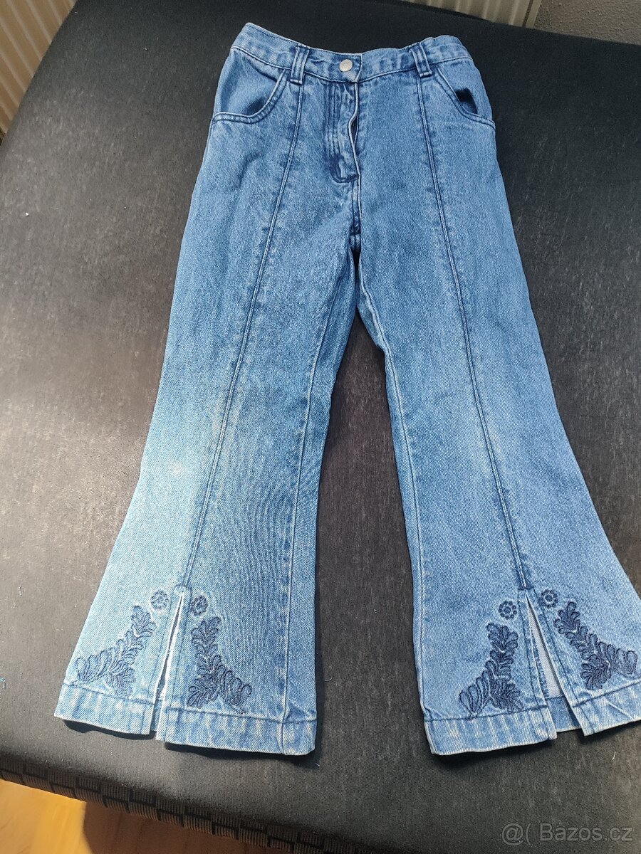 Málo používané, moderní širší nohavice s výšivkou a rozparkem, rozměry ve fotografiích