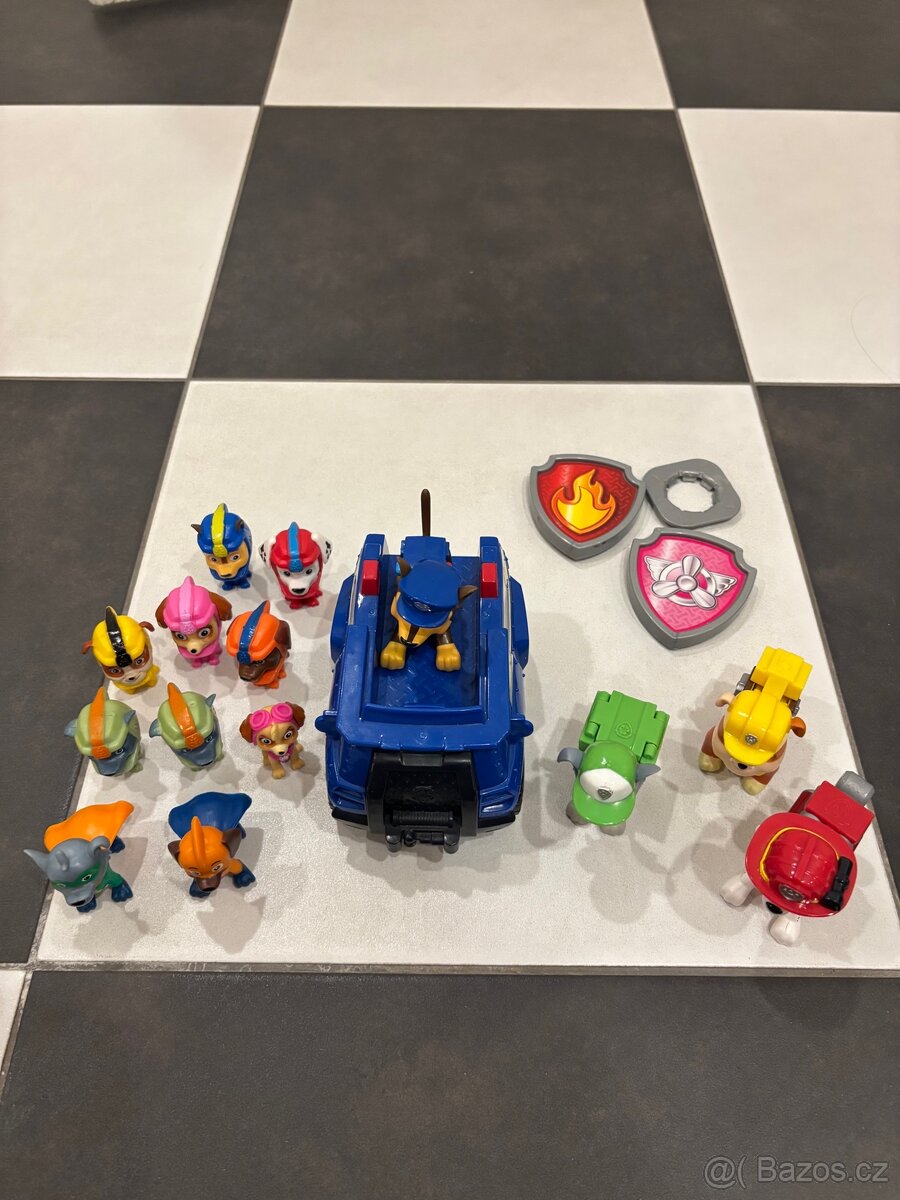 Tlapková patrola set hraček. Tři postavičky mají speciální vystřelovací nástroje. Je to vidět na fotce v rozloženém stavu.
