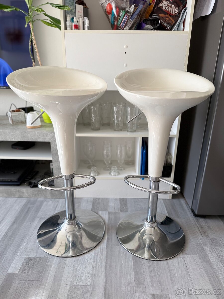 Barová židle, nastavitelná výška, kovová noha s opěradlem, bílé plastové sedadlo Prodám obě za 800,-