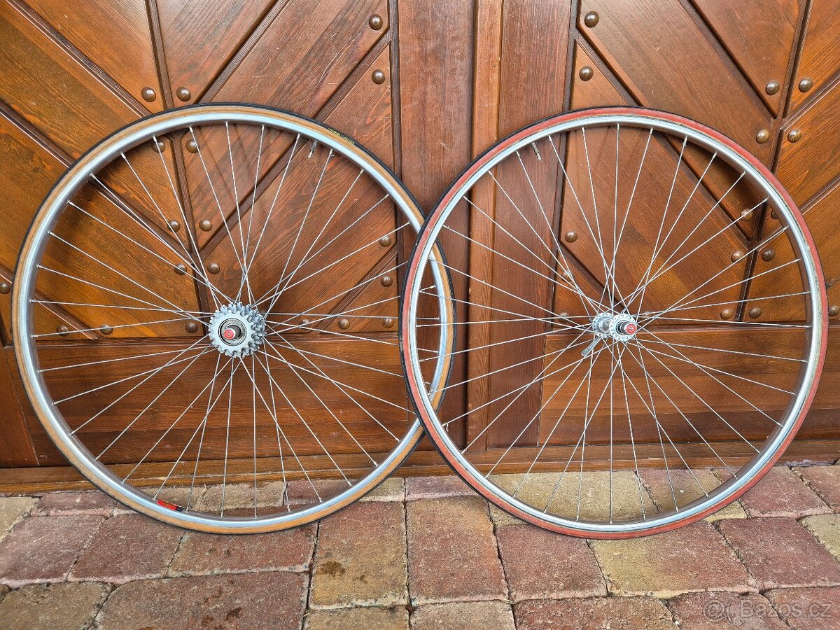 Krásné výplety, ráfky Mavic, náboje Renak, galusky Tufo. Nová kazeta Regina. Vhodné pro stavbu kola Favorit F1.