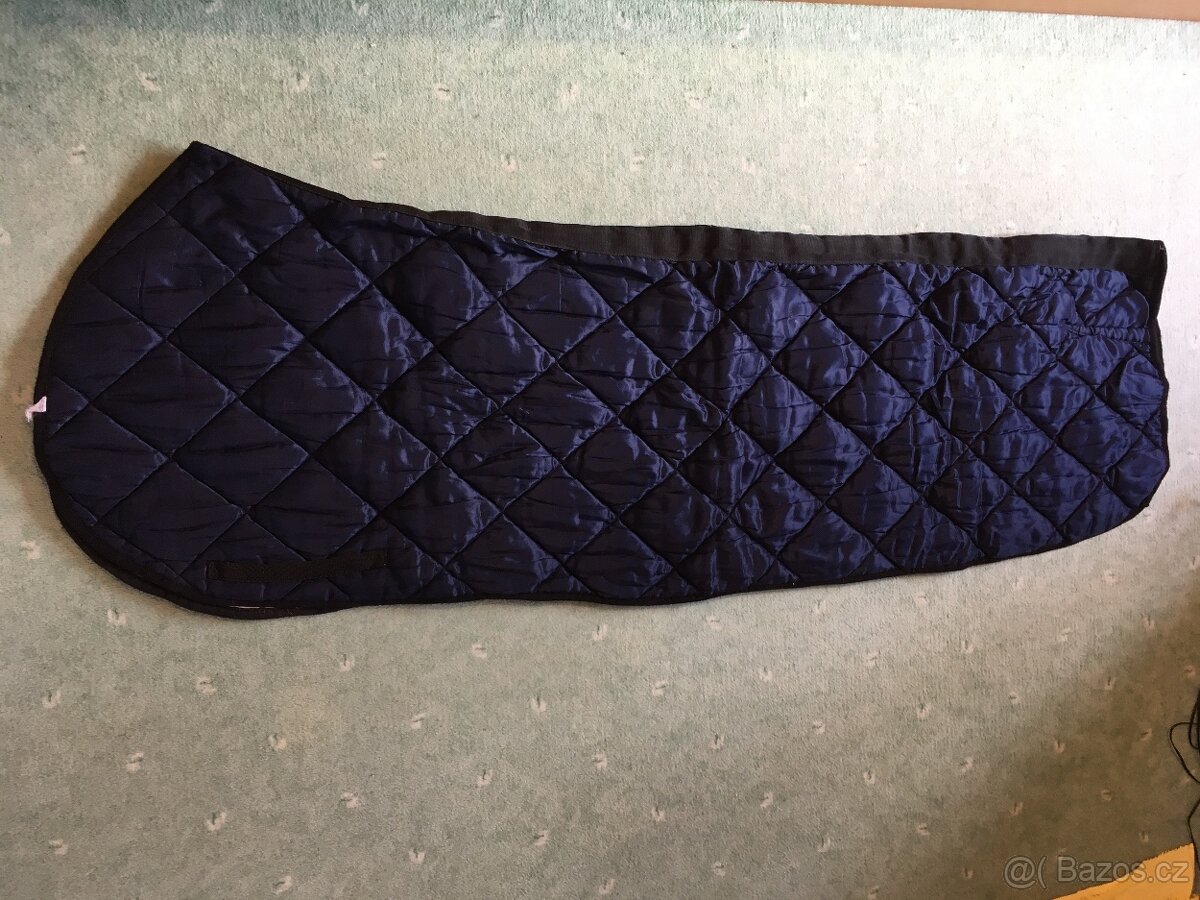 Bederní deka, tmavě modrá, prošívaná. Poutka na obřišník nebo podbřišník. Supr na lonžování nebo pod sedlo, lze na ní rovnou sedlat. Vnitřní materiál bavlna. Sedí na koně s velikostí deky 135 cm.
