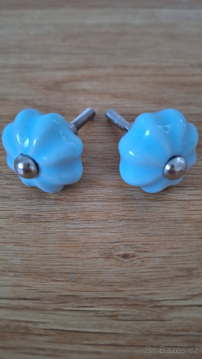 Dekorativní úchytky ve tvaru sluníčka/květu s ozdobným kovovým detailem. Parametry: • Keramická nábytková úchytka – knopka s pastelově modrou glazurou. • Průměr úchytky cca 3 cm. • Úchytka je připravena ke snadné montáži. • Součástí balení jsou kovové komponenty: šroub, ozdobná podložka a matice. TOP stav - jako nové! Cena: 50 Kč za pár (2 ks).