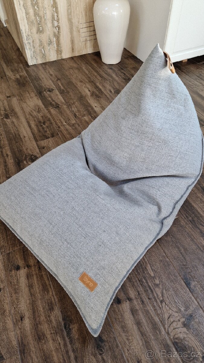 Sedací vak značky FAYNE, jen vyzkoušený, nehodí se nám barevně. Šedá melanž, koženkové poutko.