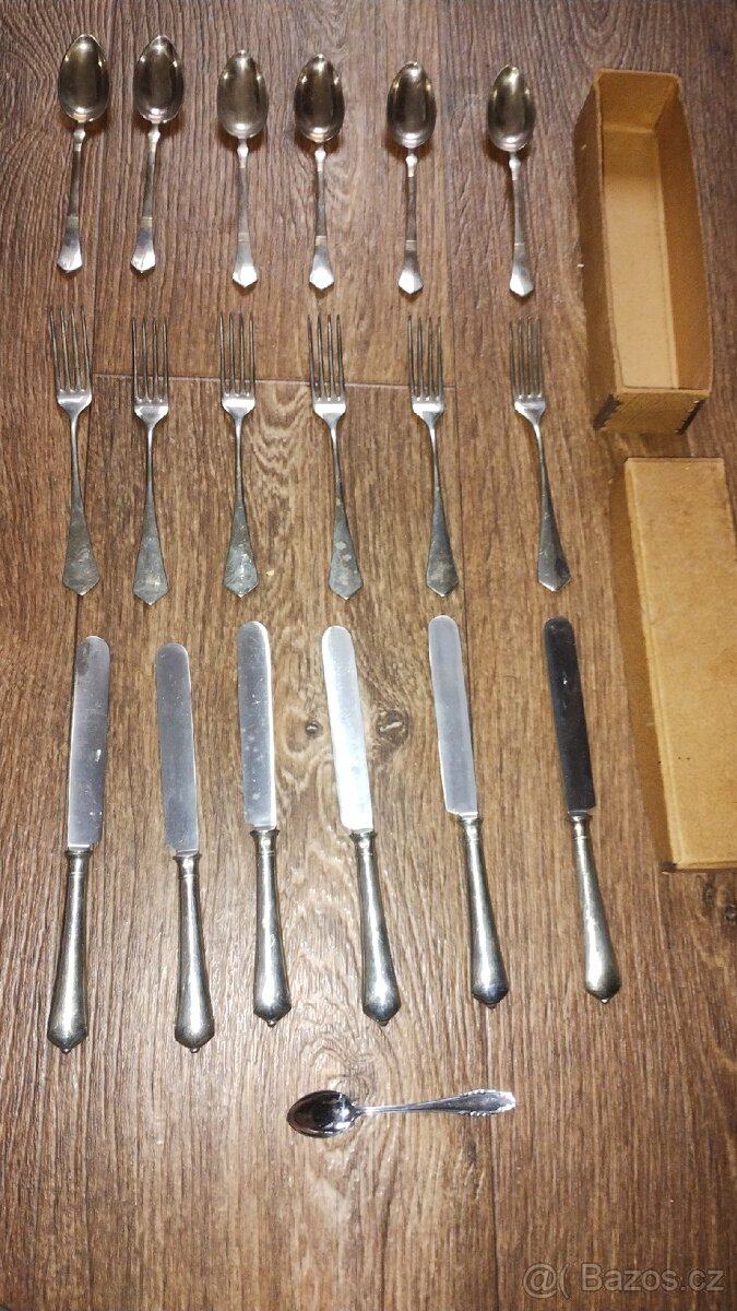 Sada příborů s krabičkou, nejspíš alpaka.Stav dle foto.Cena bez dopravy, Zásilkovna.Po Praze lze po dohodě vyzvednout v prodejně na metru C Ládví Po-pá 13 -19h víkendy zavřeno