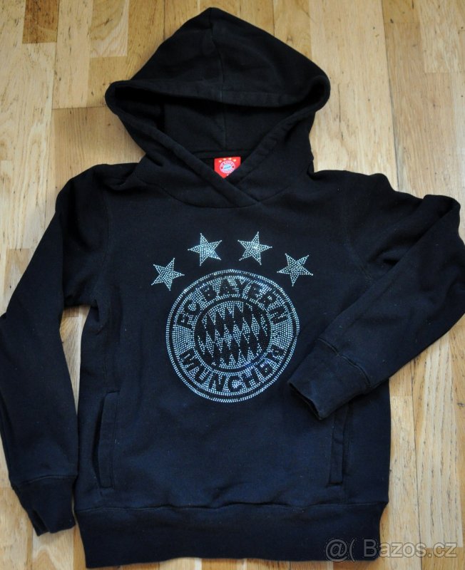 Damska cerna mikina zn.Adidas by Bayern Munchen, vel.S, nadherna klokanka s kapucou nejen pro fanousky Bayernu, kvalitni hodne pevna a pomerne tlusta bavlna,, kontrasntni napis tvoreny stribrnymi a cernymi lesklymi kaminky, celkova delka 61cm, sirka pod pruramky 48cm,nosene minimalne, jednou vyprane, puvodni cena 50 EUR, nyni 800Kc + 104 doporucene postovne