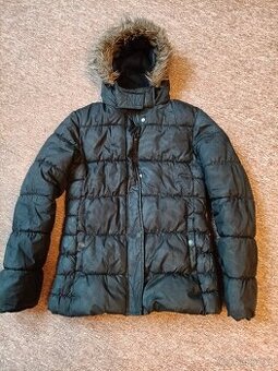 Slušivý kabátek s kapucí, černá vel. 152 v pěkném stavu. Kabátek má jemný lesklý černý ,jakoby tygrovaný vzor.