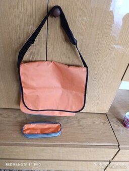 oranžovo-šedivé, rozměry zhruba 40 x 40 cm, uvnitř jeden prostorný oddíl, klopna na 2 suché zipy. Popruh s možností změny délky /do ruky i přes rameno/. K tomu malé pouzdro - na brýle, na psací potřeby, na peníze....Nikdy nebylo použito!