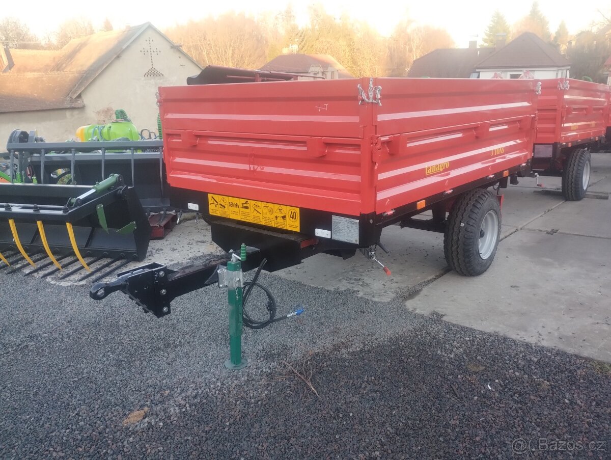 Jednoosý návěs za traktor o nosnosti 3000 kg, ložná plocha 180x280 cm. Výška ložné plochy 75 cm, třístranně sklopný. Bočnice 40+30 cm. Plech podlahy 4 mm. Homologace, bezproblémové přihlášení na SPZ. Cena včetně DPH.