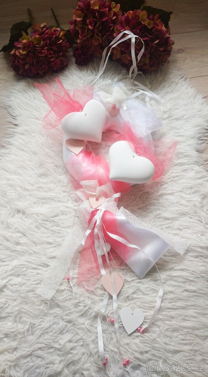 Krásná svatební dekorace, využita jednou jako dekorace na dveře. Základ je tvořen z kruhu, srdíček, organzy, perliček a stužek. Lze zaslat zasilkovnou nebo poštou, cena 299,-+doprava.