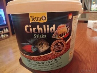 Prodám 10l.krmiva pro akvarijní rybky,Tetra Cichlid sticks vhodné i pro venkovní jezírka. Puv.cena 1200kc nyní 700kc