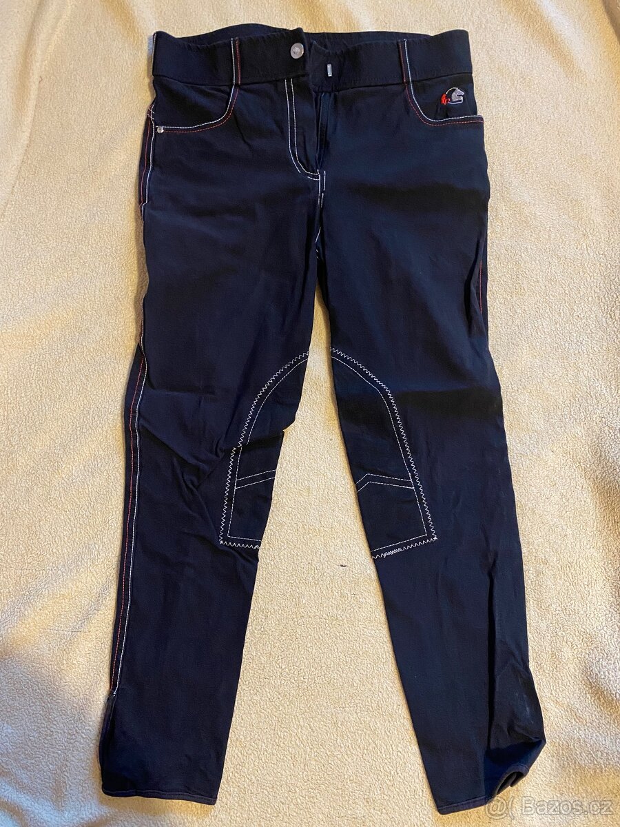 Velikost 40/L. Rajtfleky na kolenou. Kontrastní prošití