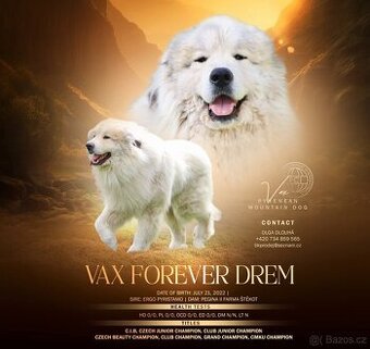 Nabízím krytí 3 letým chovným psem Pyrenejský horský pes – Vax Forever Drem Vax je typický představitel plemene s vyrovnanou povahou, elegantním exteriérem a mimořádnými výstavními úspěchy. Vax Forever Drem s PP (FCI) Zdravotní výsledky: Vax je po všech stránkách naprosto zdráv HD A PL 0/0 ED 0/0 OCD clear DM N/N LTV negativní Vax je velmi milý, přátelský a společenský pes, který vyhledává kontakt s lidmi. Miluje děti, je poslušný, klidný a přátelský ke všem zvířatům. Skvěle reprezentuje ideální povahu Pyrenejského horského psa – vyrovnaný, oddaný a s vrozeným smyslem pro ochranu rodiny. 🏆 Výstavní úspěchy C.I.B – Mezinárodní šampion krásy Czech Junior Champion Club Junior Champion Czech Beauty Champion Club champion Grand Champion ČMKU Champion Krytí možné po předchozí domluvě. 📞 Kontakt: 734 859 565 📧 E-mail: [email protected]