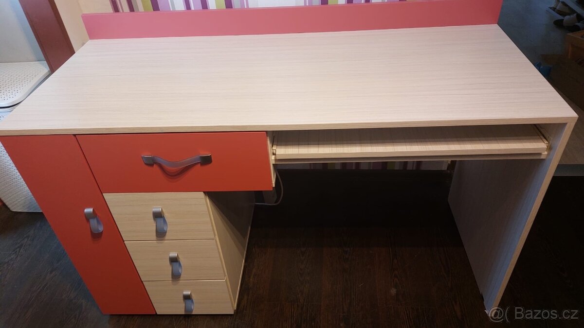 Nabízím dětský psací stůl Rozměry: Délka 135cm Hloubka 55cm Výška. 78cm Prostor pro nohy výška 64cm, šířka 83cm