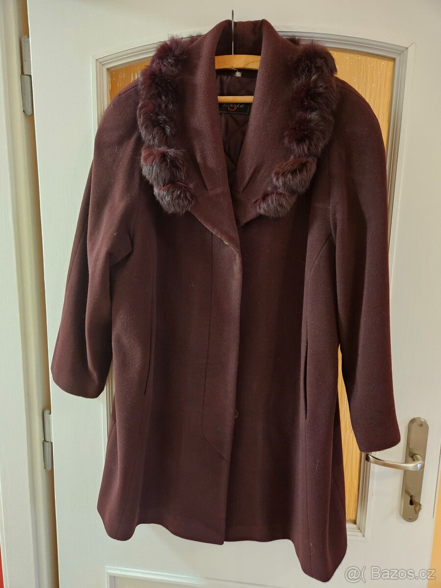 nabízím kabát dámský vel. 48, vínová barva, vlna + polyester + kašmír, kožešinka, čisté, nepiškozené, použité