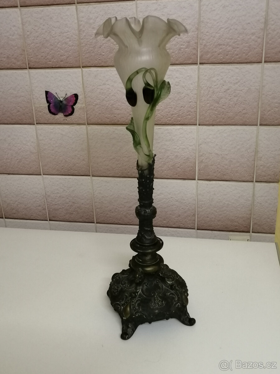 Cena: Nabídněte. Prodám starožitnou vázu. Spodek je tepaný, skleněná část se dá vyndat. Na vršku vázy chybí část ozdoby viz. foto. Výška 51 cm.