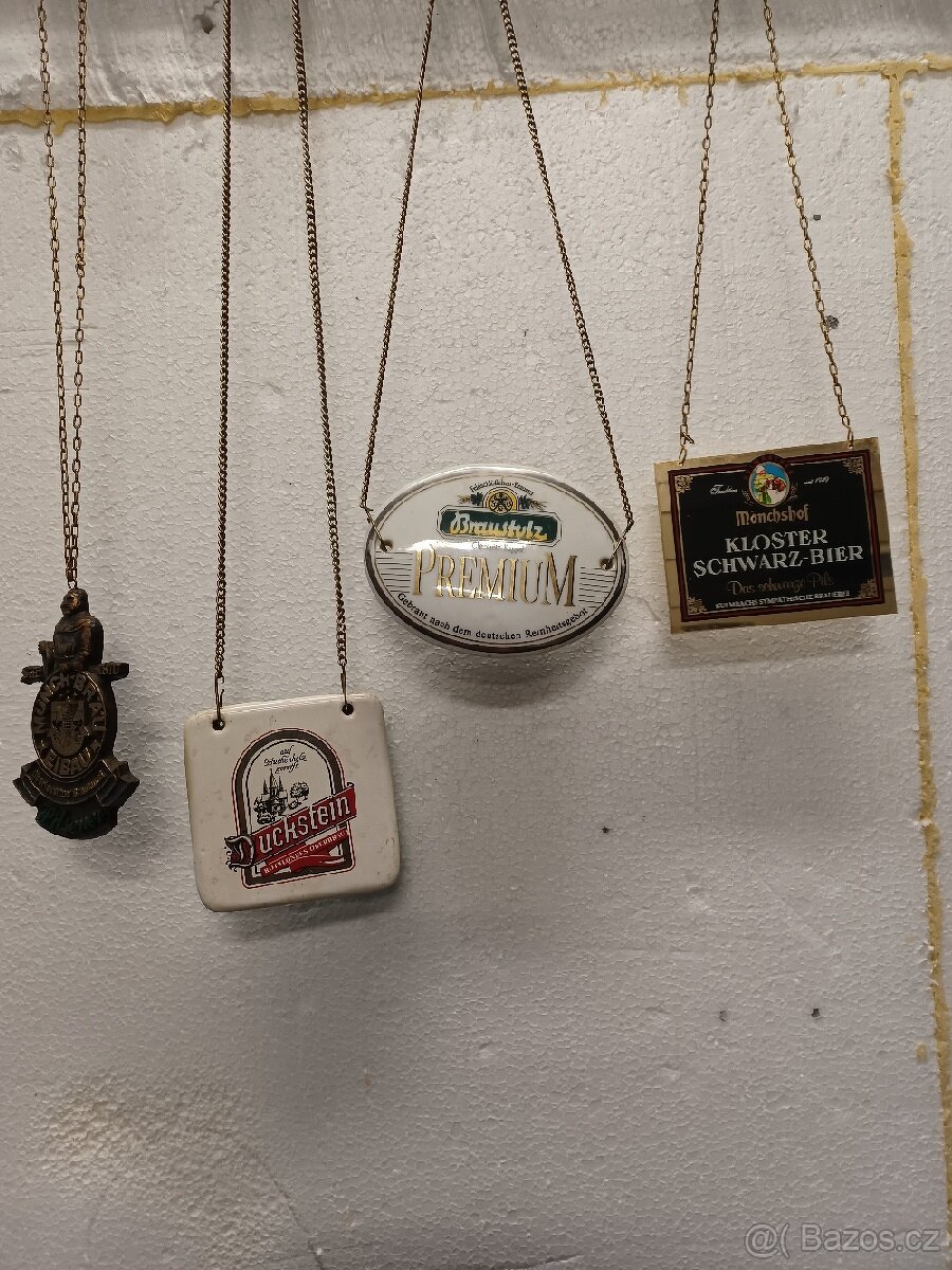 Závěsné cedulky pivovaru na pípu 2x porcelán 1x plast 1x plastový odlitek