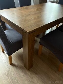 Prodám jídelní stůl plus židle,koupené v Jysku. Židle jsou bíle koženkové,ale kvůli běžnému opotřebení je na nich potah,který jde sundat a vyprat.Stůl je nezničený v hezkem stavu..vše vypadá zachovale.