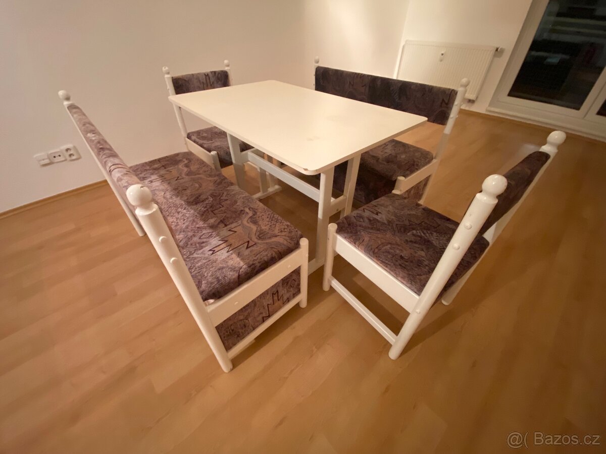 Prodám tuto starší, ale málo používanou jídelní sestavu. Stůl 70x110cm, 2x lavice s úložným prostorem 45x110cm, 2x židle 45x45cm. Lavice s židli lze spojit a vytvořit tak rohovou lavici. Místy odprýskaný lak viz foto. Čalounění bez známek opotřebení. Pouze osobní odběr, s naložením mohu pomoci. Při rychlém jednání výrazná sleva.