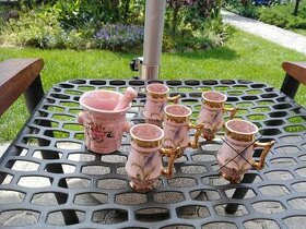 Růžový porcelán - 4 ks likérka, miniatura hmoždíř