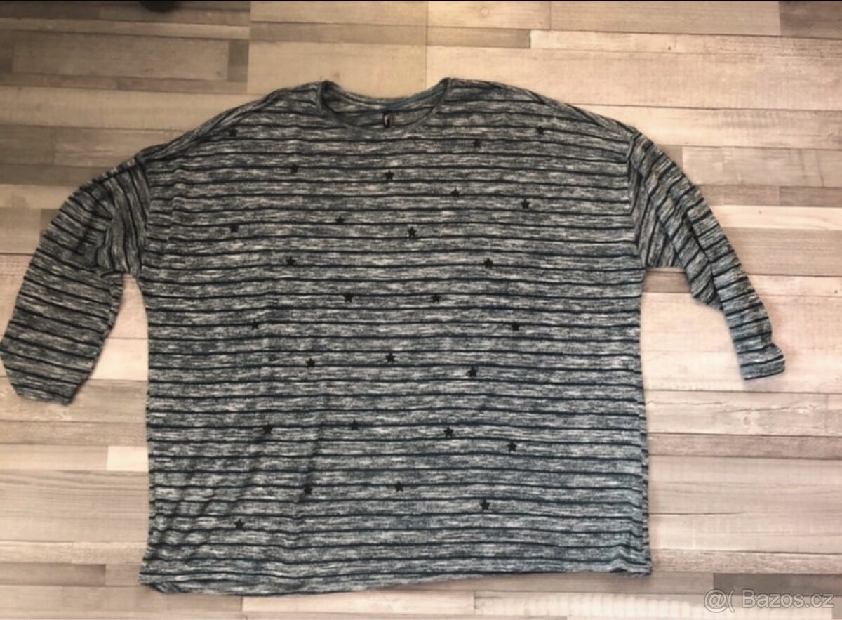 Nabízím slabší pruhovaný svetr zeleno-šedé barvy s hvězdičkami s 7/8 rukávem, vel. 54/56. J. Nový použitý párkrát. Rozměry: Délka: 78cm Obvod přes prsa: 160cm Spodní lem: 160cm Rukáv vnější od ramene: 45cm Rukáv vnitřní: 37cm.